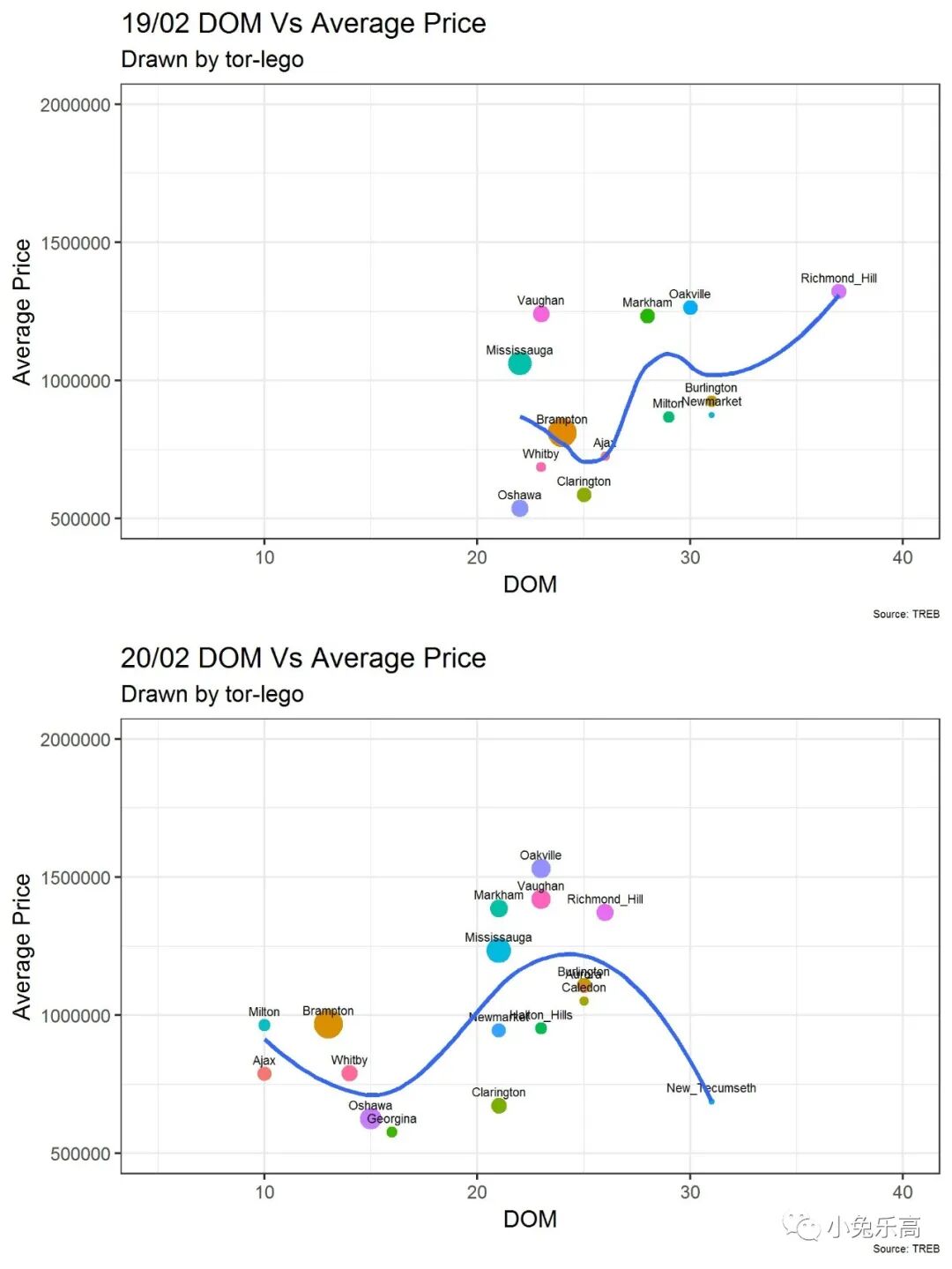 取所有成交量大于50的地区,以横轴为Days on Market, 数值越大表示越滞销,数值越小表示越受追捧。以纵轴为平均价,数值越大越贵,越小越经济。每个地区为一个点,点的吨位以成交量为标准,成交量越多,则吨位越大。上面是19年02月,下面是20年02月。