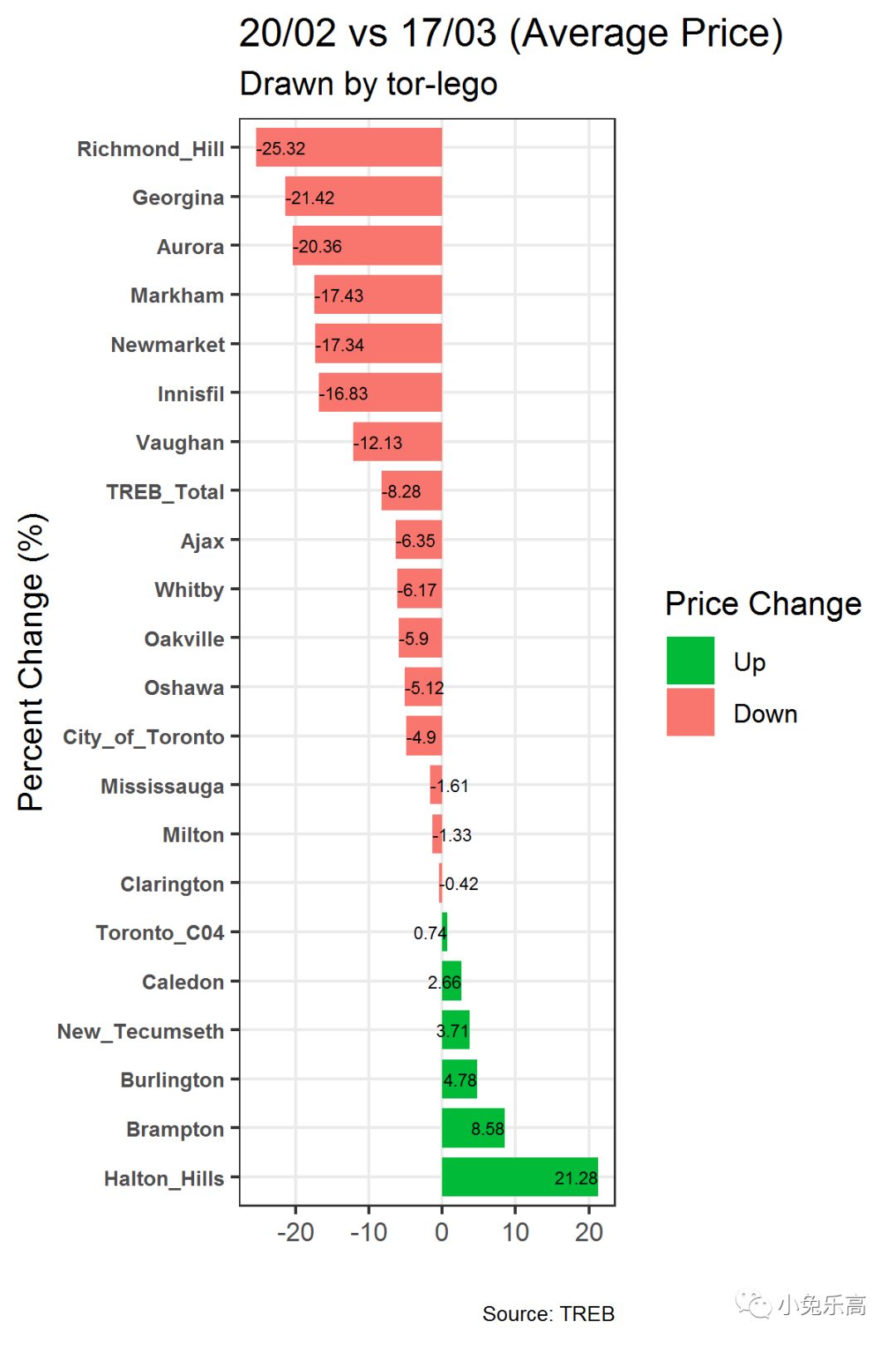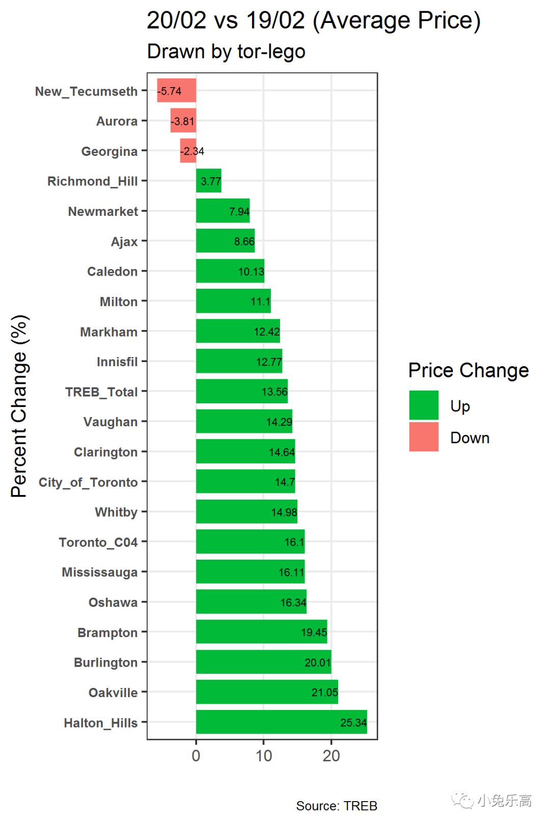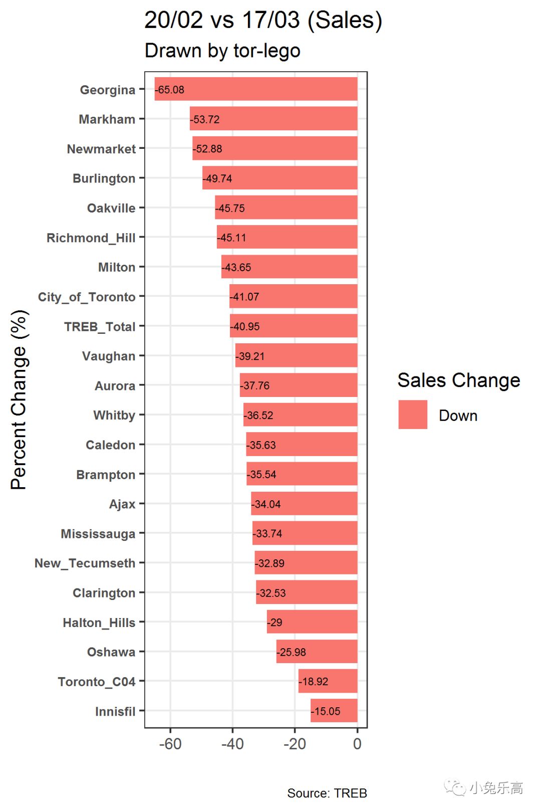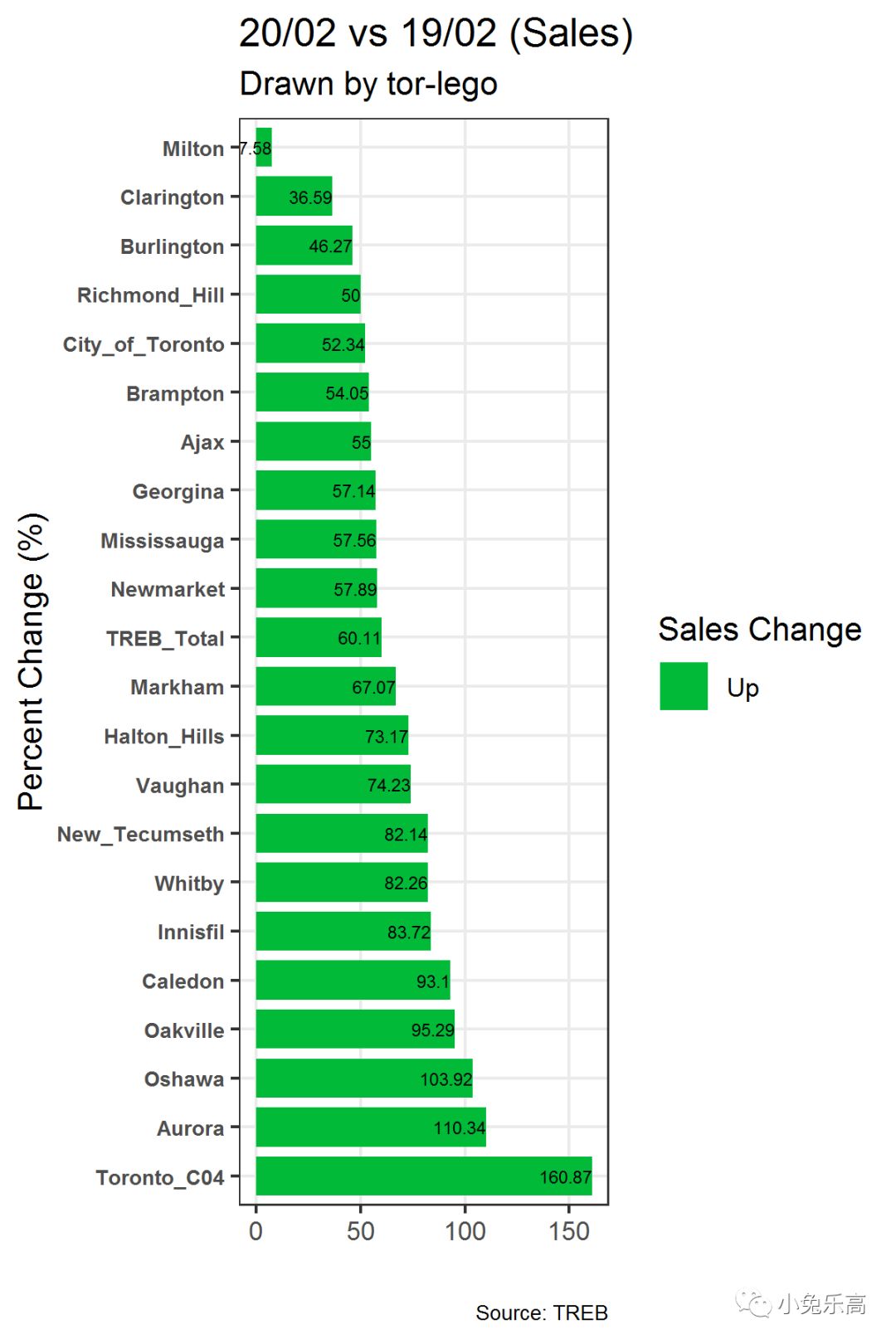 然后我们再来看看独立屋(Detached houses)各地区的横向对比龙虎榜,看看谁是赢家,谁是输家。此处我们的筛选条件为成交量大于50的地区。