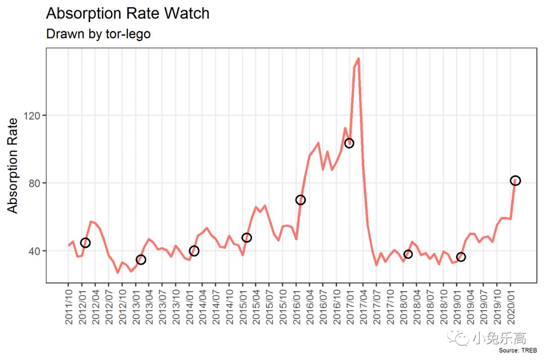 再看下图的Absorption rate(饥渴指数),等于Sales / Active Listings,也就是成交量/当前挂牌数的百分比,Luda哥称之为买家的饥渴指数。饥渴指数高,表示市场活跃;数值低,则表示市场停滞。